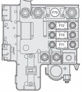 | Caixa de controlo do compartimento do motor (versões a gasolina) | Bateria (pólo positivo) | F70 (MEGA-FUSÍVEL) | 125 |