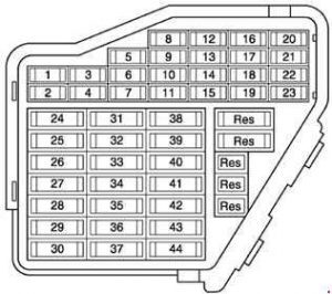 | 44 | 30 | Relé de aquecedor auxiliar Relé de isolamento de células solares 2 Controlador do assento do condutor aquecido Ajustador do banco do passageiro da frente aquecido Interruptor aquecido do banco traseiro esquerdo com ajustador Interruptor do banco traseiro direito aquecido com regulador |