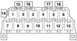 | 17 | Fusível de taxímetro e sistema de alarme (cabina) – S183 Fusível C (veículos da polícia) – S203 Fusível do sistema de intercomunicação (veículos especiais) – S253 Fog fusível (luzes diurnas permanentes – Canadá) – S28 |