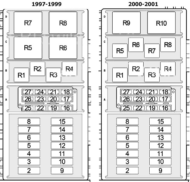| R5 | 1997-1999: Ventilador do radiador; 2000-2001: Bomba de combustível |