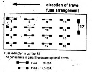 Fusível de isqueiro (tomada eléctrica) em Mercedes Classe S w140 (1992). é o fusível 16 na caixa de fusíveis.