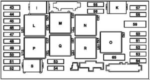 | 45 | Unidade de controlo de airbag ARMADA (até 2008). Indicador de airbag e luz de aviso (até 2008). Unidade de controlo de sistemas de segurança (a partir de 2009). Sensor de reconhecimento de cadeira de passageiro dianteira ocupada e de segurança infantil (a partir de 2009 .; EUA). Unidade de controlo do sistema de detecção de peso (WSS) (a partir de 2009 .; EUA) |