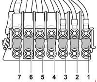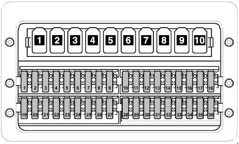 | 33 | 15/30 / 7,5 | Não utilizado Controlador para porta deslizante direita -J731-(a partir de Maio de 2012); Encravamento relé 1 para caixa de tablier -J1010-(a partir de Janeiro de 2012); Encravamento relé 2 para caixa de tablier -J1011-(a partir de Janeiro de 2012); Encravamento relé 3 para caixa de tablier – J1012-. (a partir de Janeiro de 2012); Compressor de ar comprimido -V534 -. (a partir de Janeiro de 2012) |